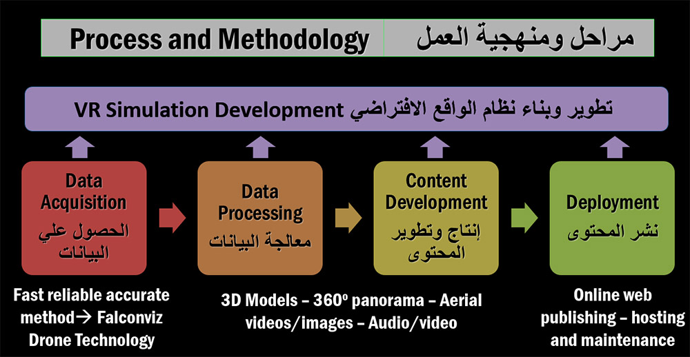 في هذه المرحلة سنقوم بتحويل كل البيانات والمخرجات من عملية معالجة البيانات إلى محتوى تفاعلي شيق وجذاب والذي يتضمن العديد من أنواع المحتوى على سبيل المثال لا الحصر: الفيديوهات عالية الدقة – الصور البانوراما 360 درجة – النماذج ثلاثية الأبعاد والتي يمكن تفقدها باستخدام تقنية الواقع الافتراضي – الخرائط الثنائية والثلاثية الأبعاد – الوصف التاريخي والمكاني)